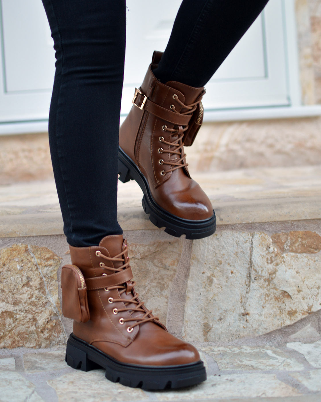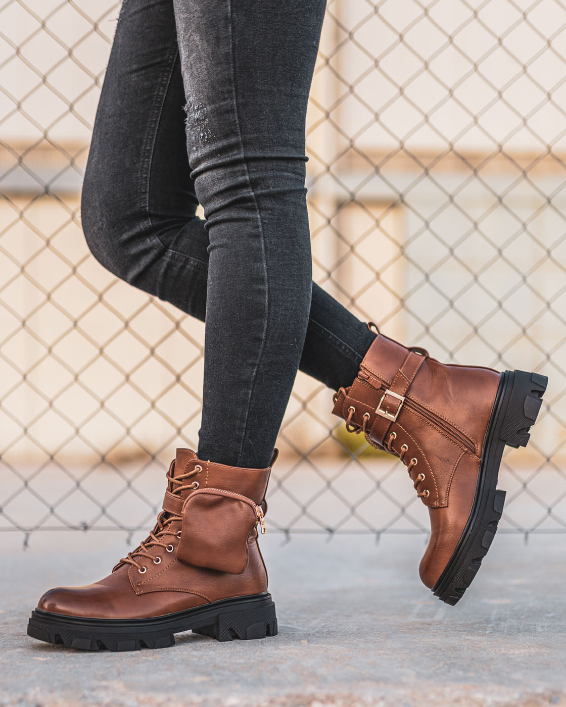 Αρβυλάκια σε χρώμα κάμελ με μαύρη σόλα. Έχουν εξωτερικό σχέδιο με τσεπάκι στο πλάι. Διαθέτουν φερμουάρ στο πλάι και προσαρμογή με κορδόνια.