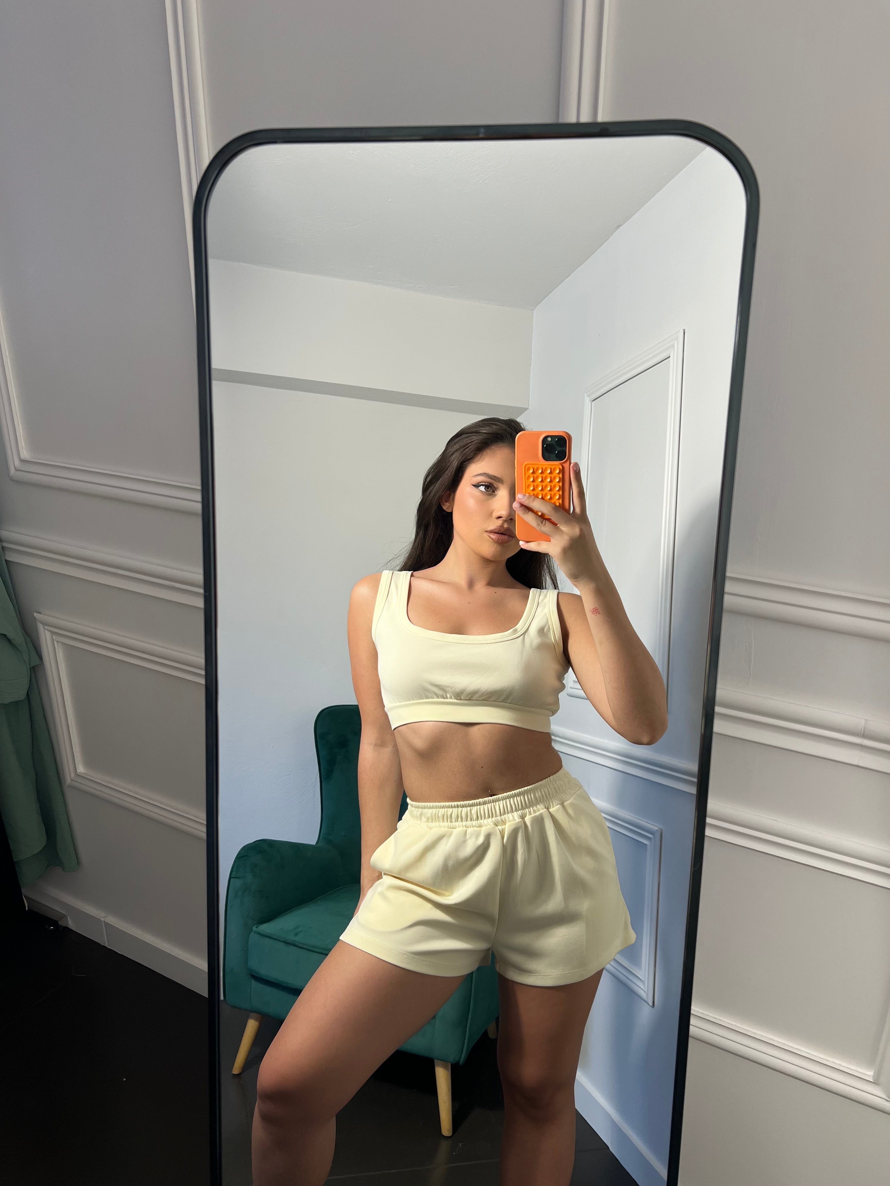 Σετ τοπ-Σορτσάκι σε απαλό κίτρινο χρώμα