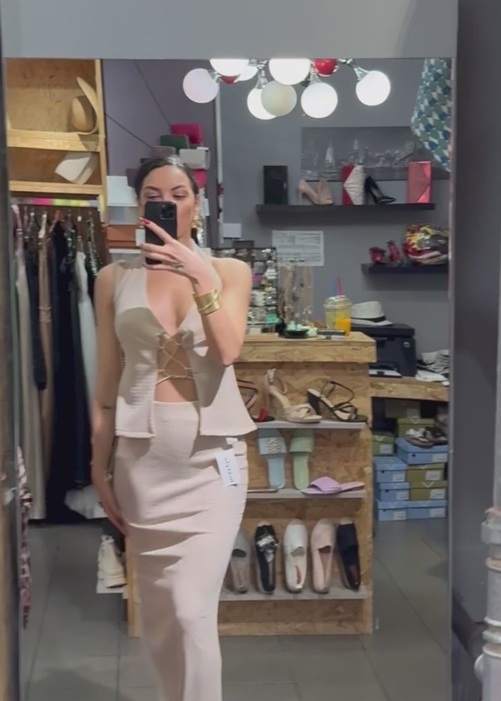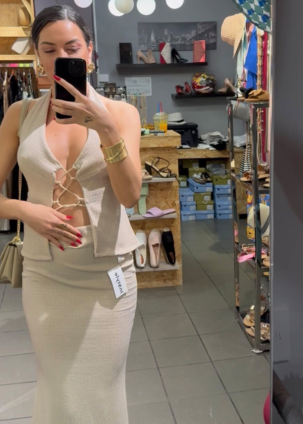 Σετ Τοπ-Φούστα σε μπέζ χρώμα.