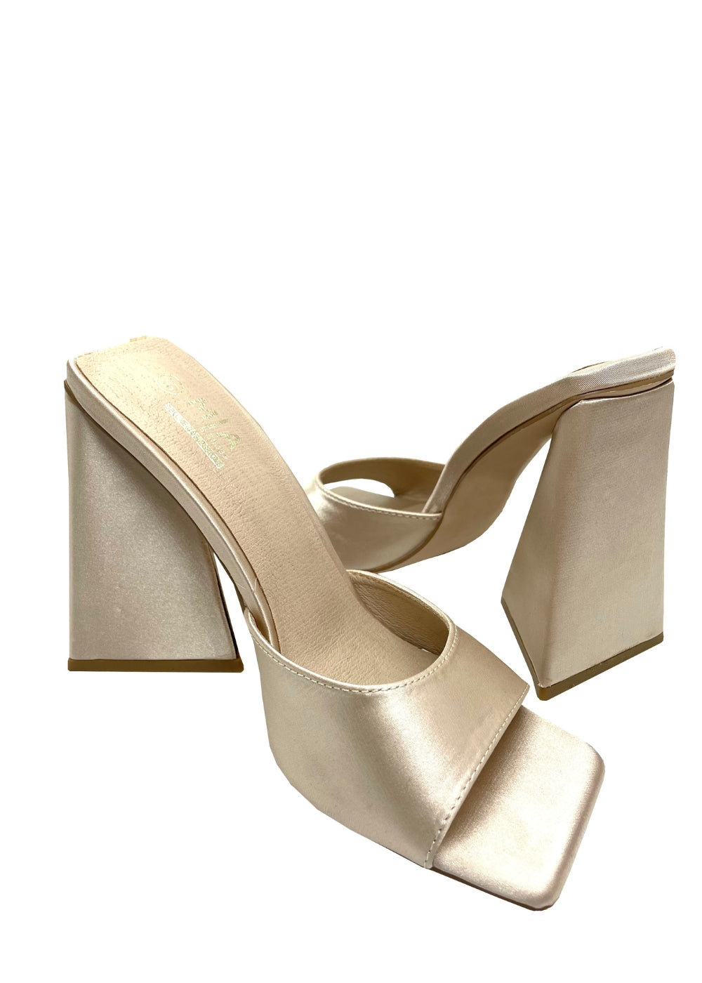 Σατέν Mules σε μπέζ χρώμα με ξεχωριστό τακούνι και αντιολισθητική σόλα για καλύτερη εφαρμογή.